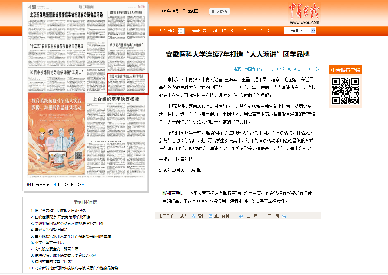 该校自2013年开始,连续7年在新生中开展“我的中国梦”演讲活动,打造人人参与的思想引领品牌,超3万名学生参与其中。每年的演讲活动采用逐轮晋级的方式进行理论自学、教师领学、演讲互学、实践深学等,确保每一名新生都有上台机会。