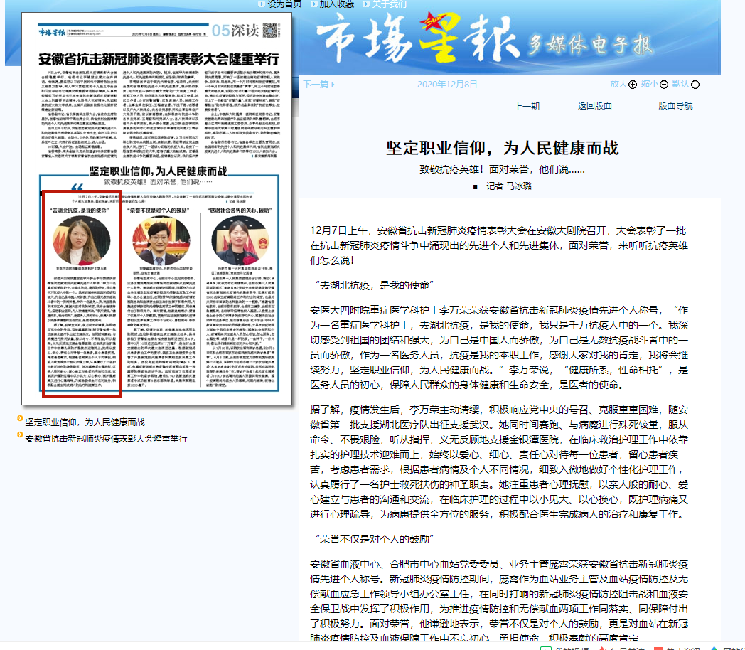 安医大四附院重症医学科护士李万荣荣获安徽省抗击新冠肺炎疫情先进个人称号,“作为一名重症医学科护士,去湖北抗疫,是我的使命,我只是千万抗疫人中的一个。我深切感受到祖国的团结和强大,为自己是中国人而骄傲,为自己是无数抗疫战斗者中的一员而骄傲,作为一名医务人员,抗疫是我的本职工作,感谢大家对我的肯定,我将会继续努力,坚定职业信仰,为人民健康而战。”李万荣说,“健康所系,性命相托”,是医务人员的初心,保障人民群众的身体健康和生命安全,是医者的使命。