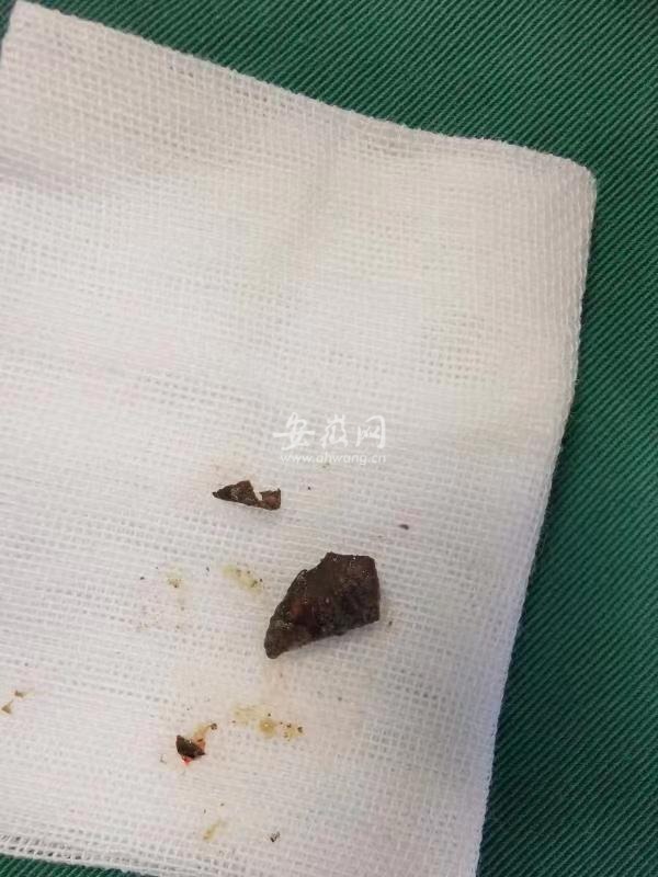 术中医生发现王大爷的左下叶基底段支气管内有大量脓性分泌物阻塞管腔,清除这些分泌物后果然有一枚骨性异物显露出来,不仅嵌顿阻塞支气管,而且已严重腐蚀,局部肉芽组织形成。医护团队精密协作,小心翼翼将这枚1.5cm大小深藏的骨性异物取出,支气管即刻恢复通畅。
