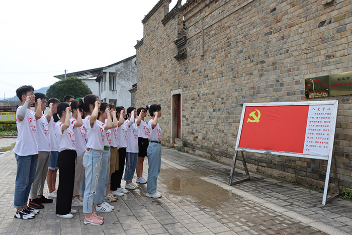 在刘邓大军高干会议旧址,面向鲜红的党旗,实践团队中的学生党员郑重高举右拳,重温入党誓词。铿锵有力的声音在大别山这片红色热土上回荡,体现了学生党员对党和人民的无限忠诚,表达了他们矢志践行初心使命的坚定决心。