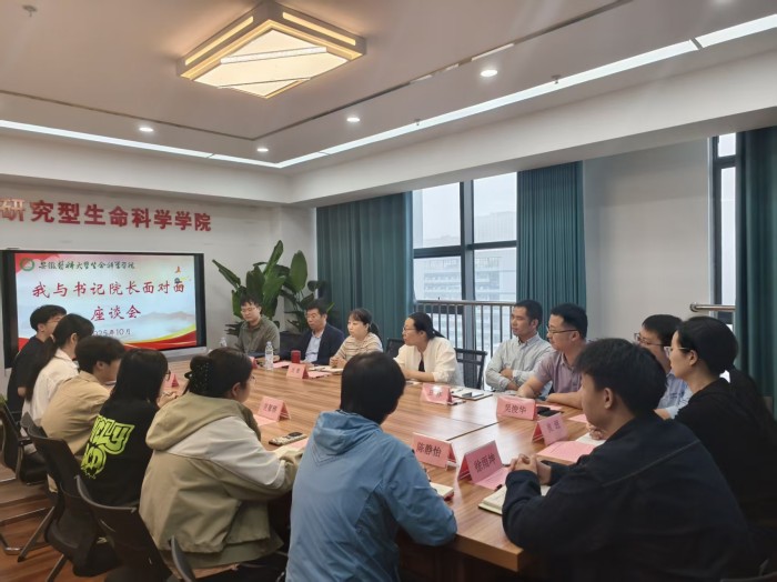 10月10日上午,生命科学学院在铜陵路校区弘毅楼12楼会议室举行师生代表座谈会。学院领导班子成员与各年级近20名学生代表,围绕学习、生活以及未来规划等多方面展开深入交流。